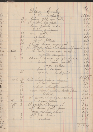 À l’endroit où vous vous trouvez se trouvait le principal café de Wamin. Situé idéalement au centre du village, les waminois s’y rendait en de nombreuses occasions. Ils venaient, par exemple, s’approvisionner en pain à la boulangerie (pétrit sur place par le boulanger jusqu’en XXX) après avoir fait le plein d’eau potable dans le puits situé au centre de la place (l’eau potable n’a été installée dans les maisons qu’autour des années 70). On venait échanger des nouvelles et on pouvait même téléphoner en étant entendu par tous les clients On buvait un café ou « une bistouille », un café mêlé d’alcool. Ce lieu était donc un café et aussi un lieu de réception. Souvent, les mariés sortaient de l’église en procession pour s’y rendre directement pour recevoir leurs convives et retrouver les messieurs qui, lors des messes, tenaient leur quartier ! C’était aussi une sorte de supermarché à taille humaine, une grande épicerie. On y trouvait de tout : de la nourriture mais aussi des objets de quincaillerie divers. Le livre de compte reconnaissable à sa la couverture noire (en photo) tenait scrupuleusement le détail des achats qu’il fallait régler comptant ou en fin de mois. Pourtant, un très bon et fidèle client, d’après la liste des très nombreux achats qu’il effectuait fréquemment, avait le privilège de ne payer qu’une fois par an ! La reproduction d’une seule page de son compte concernant les mois de juillet, août et septembre 1909 vous donne un aperçu de tout ce que l’on pouvait acheter. Une liste à la Prévert : boutons de gilet, tarte, 1 litre de genièvre, bas, savon, cire, huile mais aussi réparation de bottines ou brodequins…Notez la qualité de l’écriture !